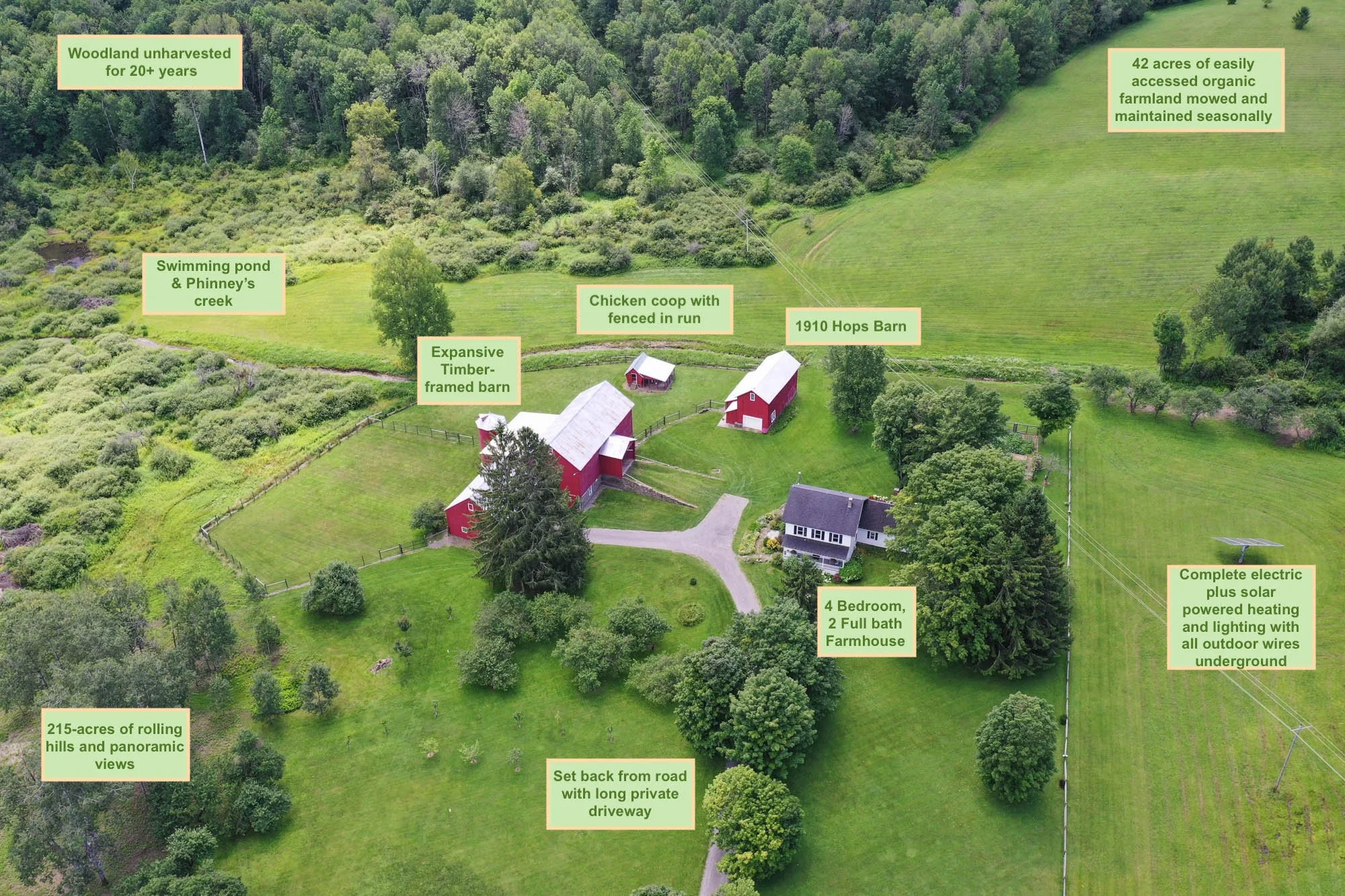 The lush land unfolds like a canvas, offering fertile fields, established orchards, and peaceful ponds waiting to be explored. Desirable features include 42 acres of easily accessed organic farmland mowed and maintained seasonally, woodland unharvested for 20+ years, complete electric plus solar powered heating and lighting with all outdoor wires underground, and close proximity to Cooperstown with subdividable with lots of road frontage.